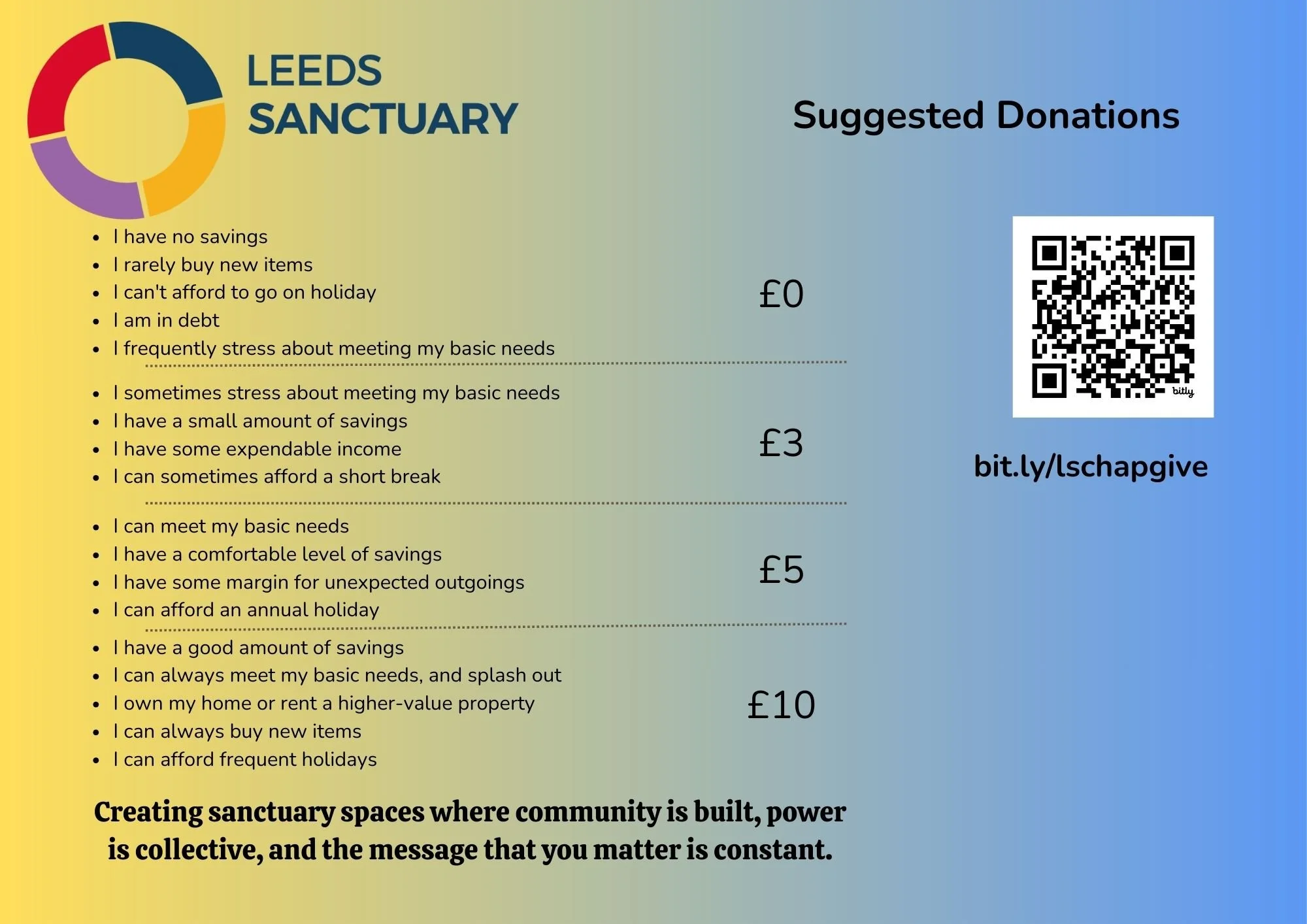 We are pleased to be able to offer our Chaplaincy service for free, but we would be grateful if you would consider making a donation or becoming a regular giver to Leeds Sanctuary so that we can continue to run these sessions for anyone who would like to come.